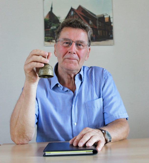 Heinrich Schmauch schwingt die Glocke im Tagungssaal.